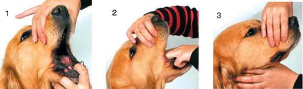 1.上あごを抑え、鼻先をお少し持ち上げ、もう一方の手で口を開けます。