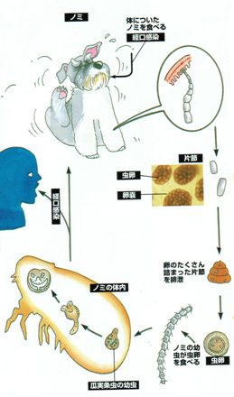 瓜実条虫の幼虫をもつノミを食べることで感染します。ヒトでは乳幼児がノミを潰した手をなめるなどして感染する例が報告されています。